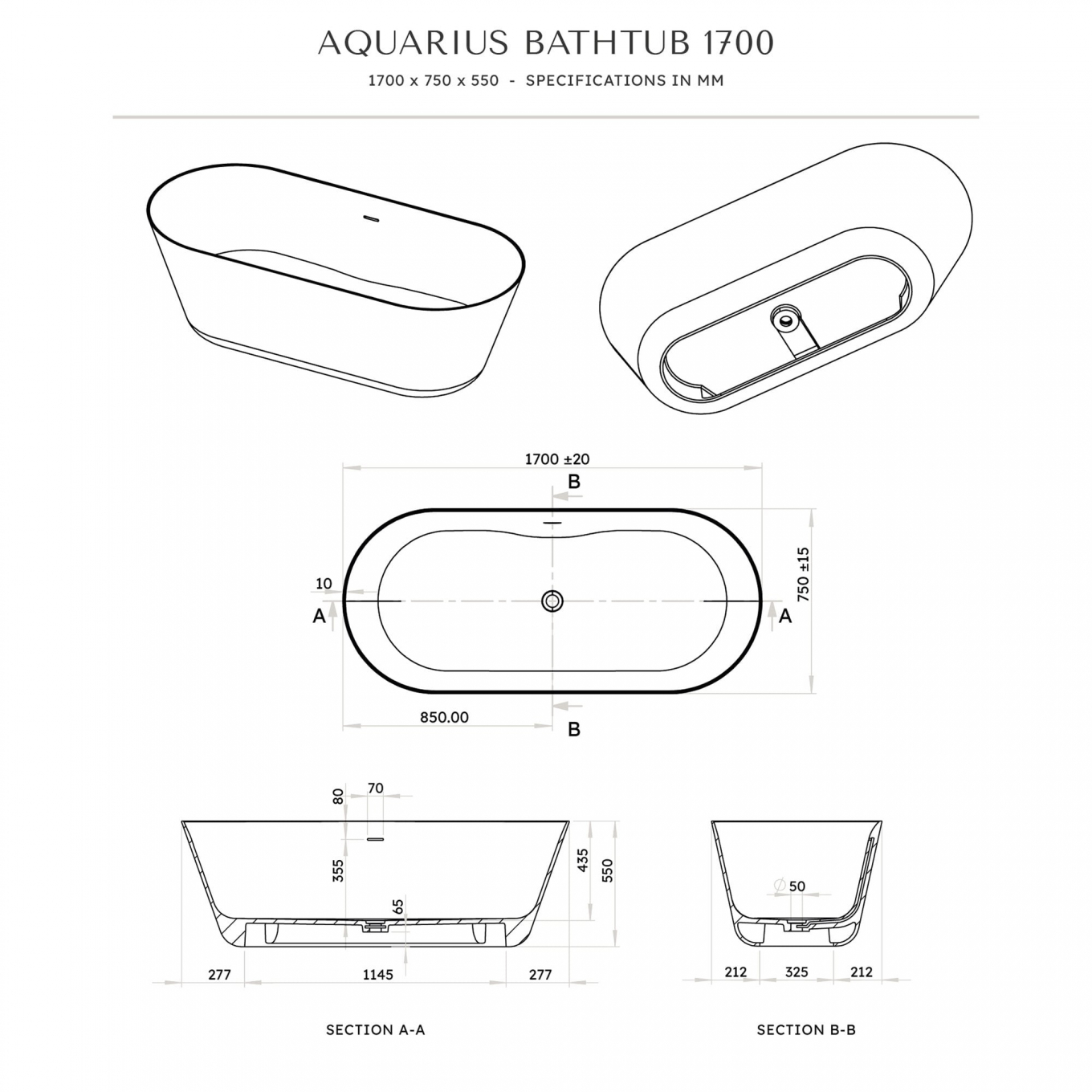 Aquarius Solid Surface Stone Resin Freestanding Bath 1700