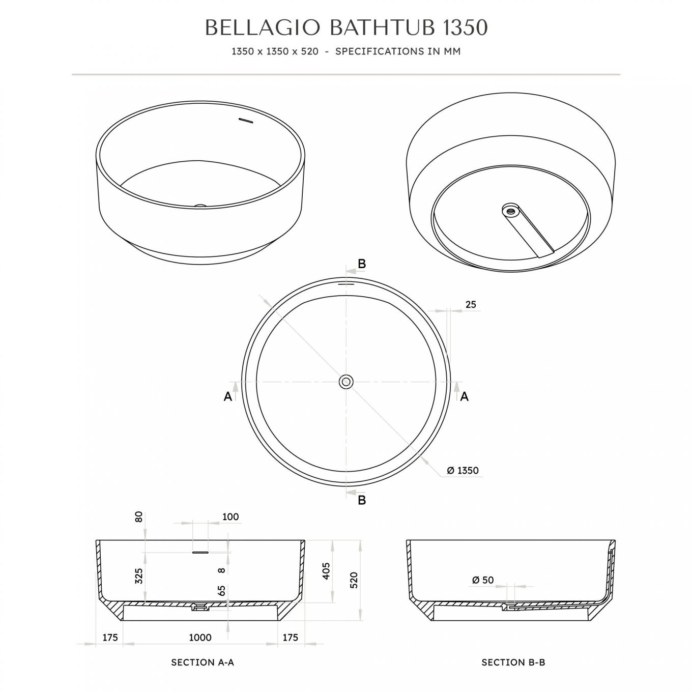 Bellagio Solid Surface Stone Resin Freestanding Round Bath D1350