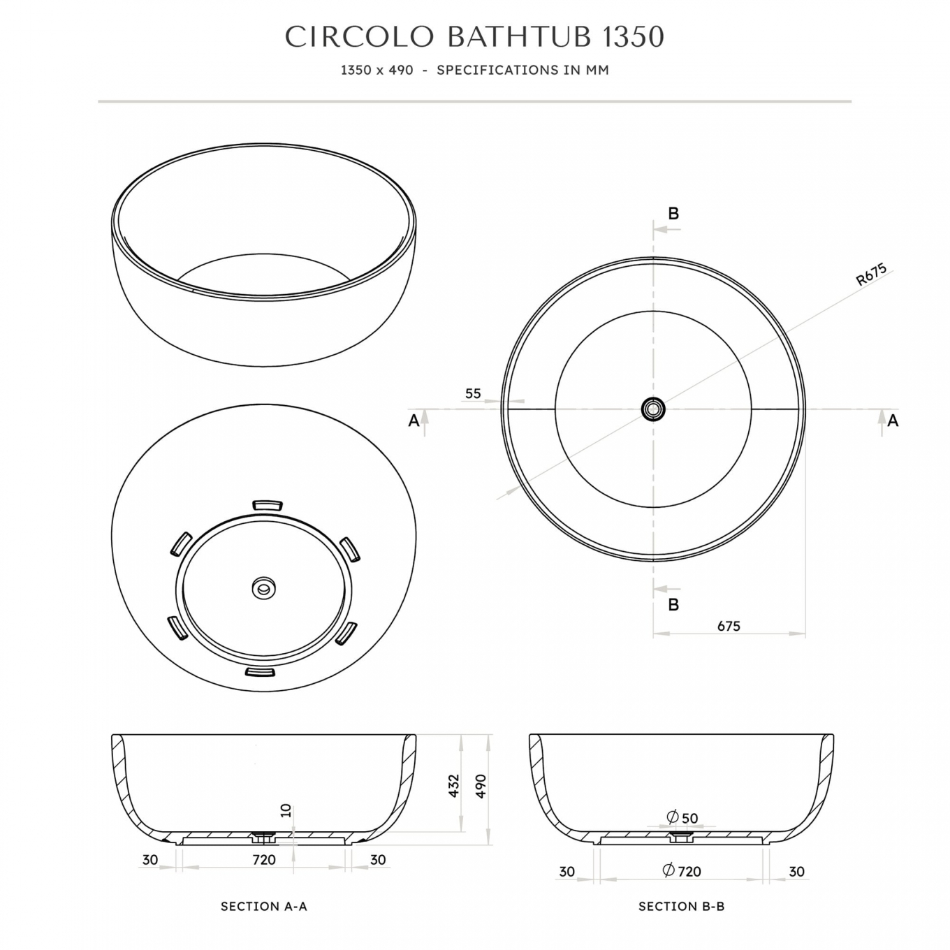 Circolo Solid Surface Stone Resin Freestanding Round Bath D1350