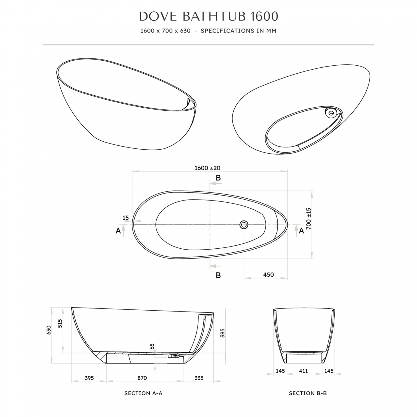 Dove Solid Surface Stone Resin Freestanding Bath 1600