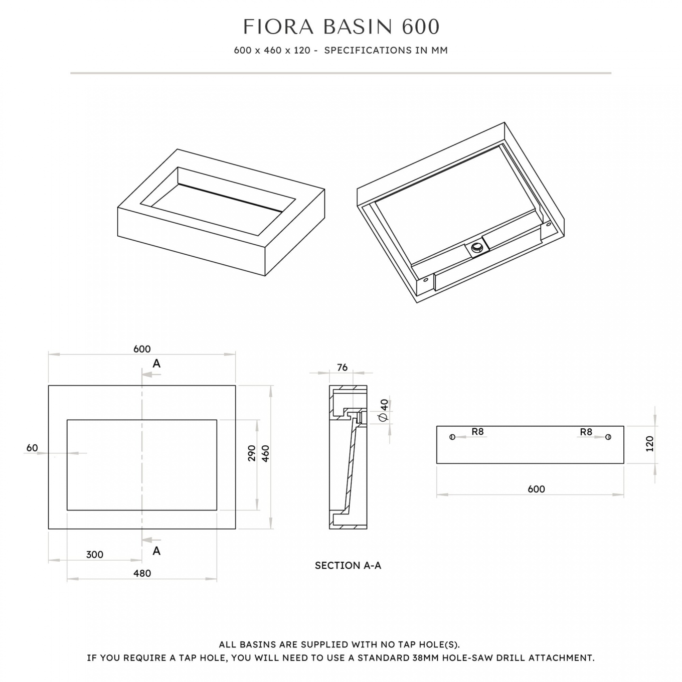 Fiora Solid Surface Stone Resin Wall Hung Basin 600