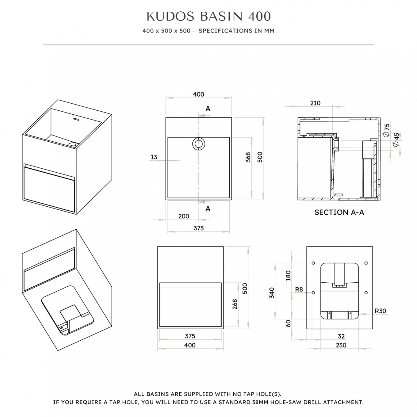 Kudos Solid Surface Stone Resin Wall Hung Vanity Unit 400