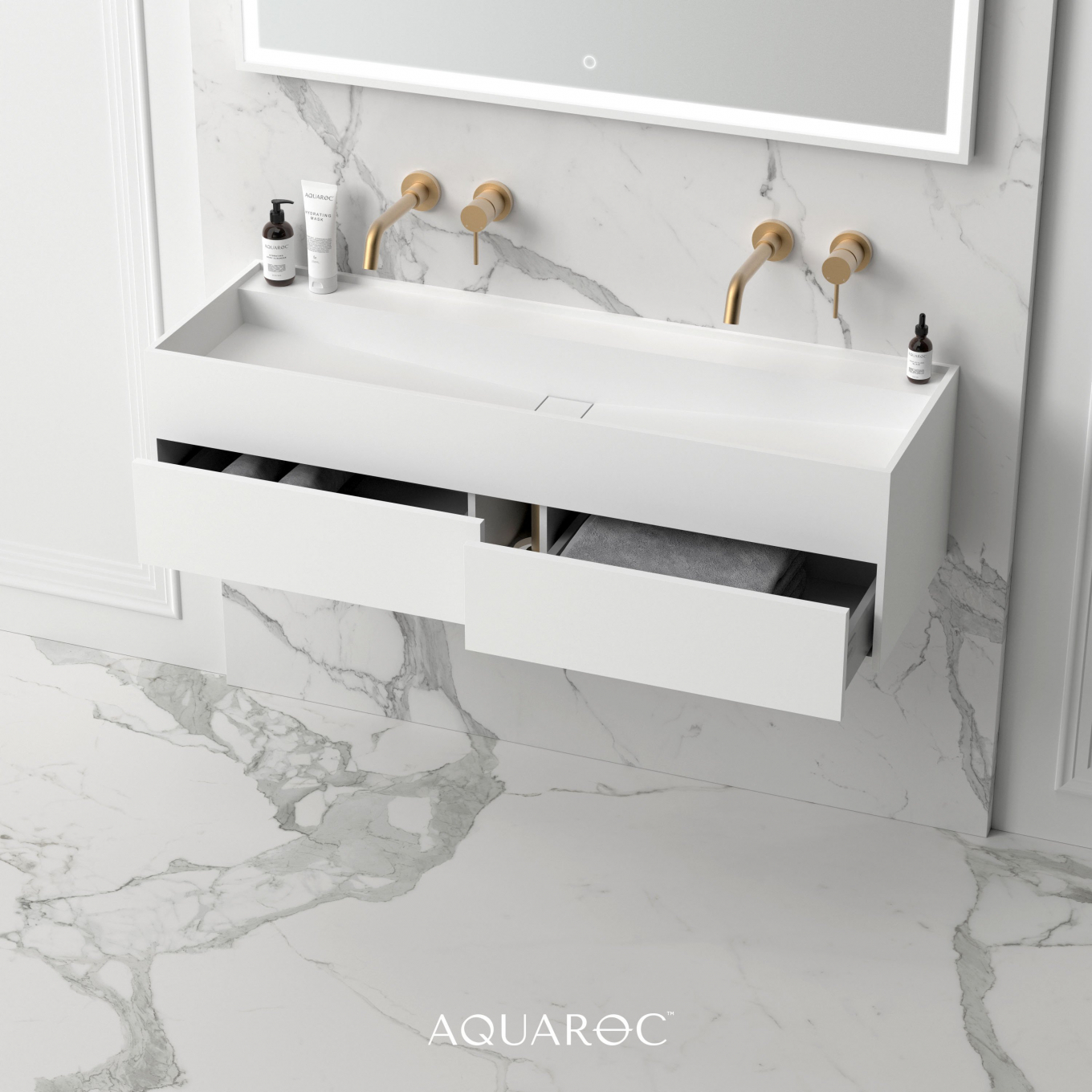 The exquisite Nero double vanity unit is entirely made from our signature stone resin material. Our team of in-house skilled craftsmen ensure each piece is finished to Aquaroc's exemplary standards. This innovative design is effortlessly stylish and would be a phenomenal addition to any bathroom space.
