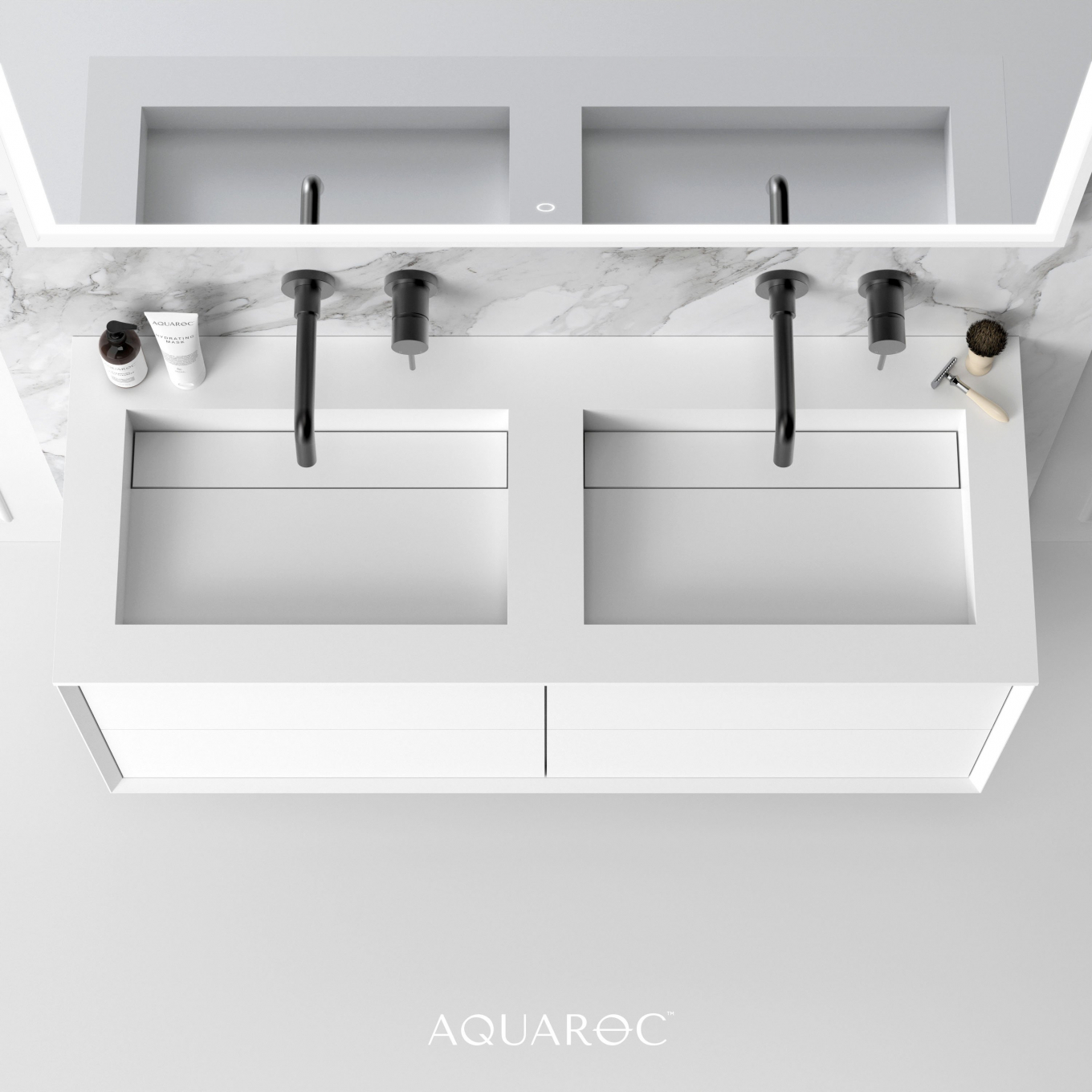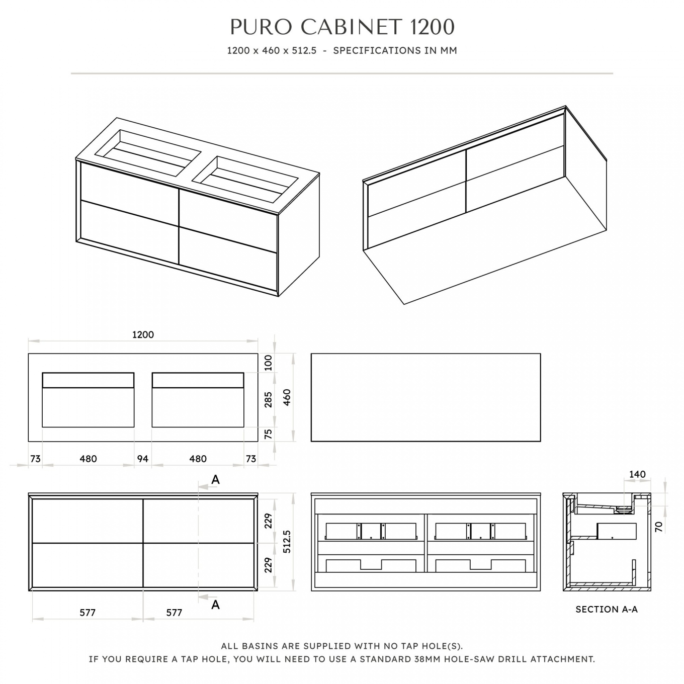 Handsomely handcrafted by our team of in-house artisans, the Puro double basin vanity unit is a must have. Featuring a bevelled edge design, push open and soft closing drawers, this vanity is sleek and sublime with four drawers for lots of stylish storage.