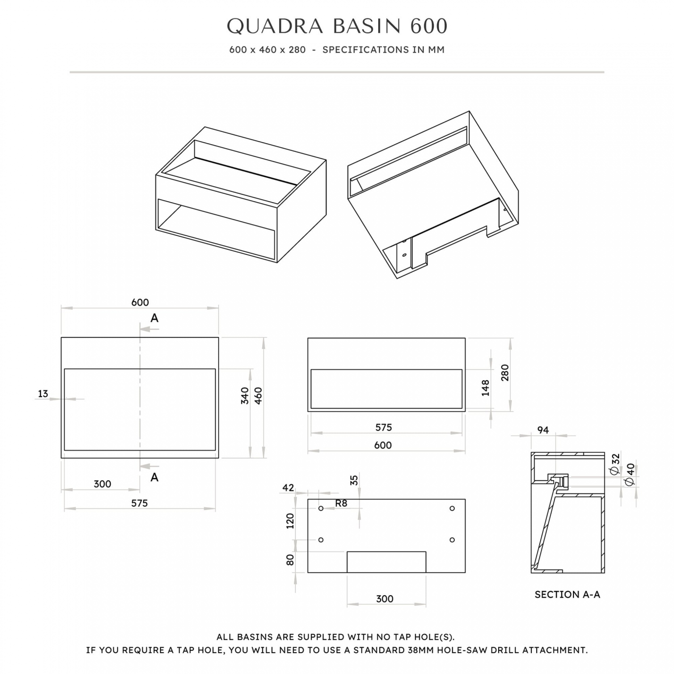 Quadra Solid Surface Stone Resin Wall Hung Basin 600