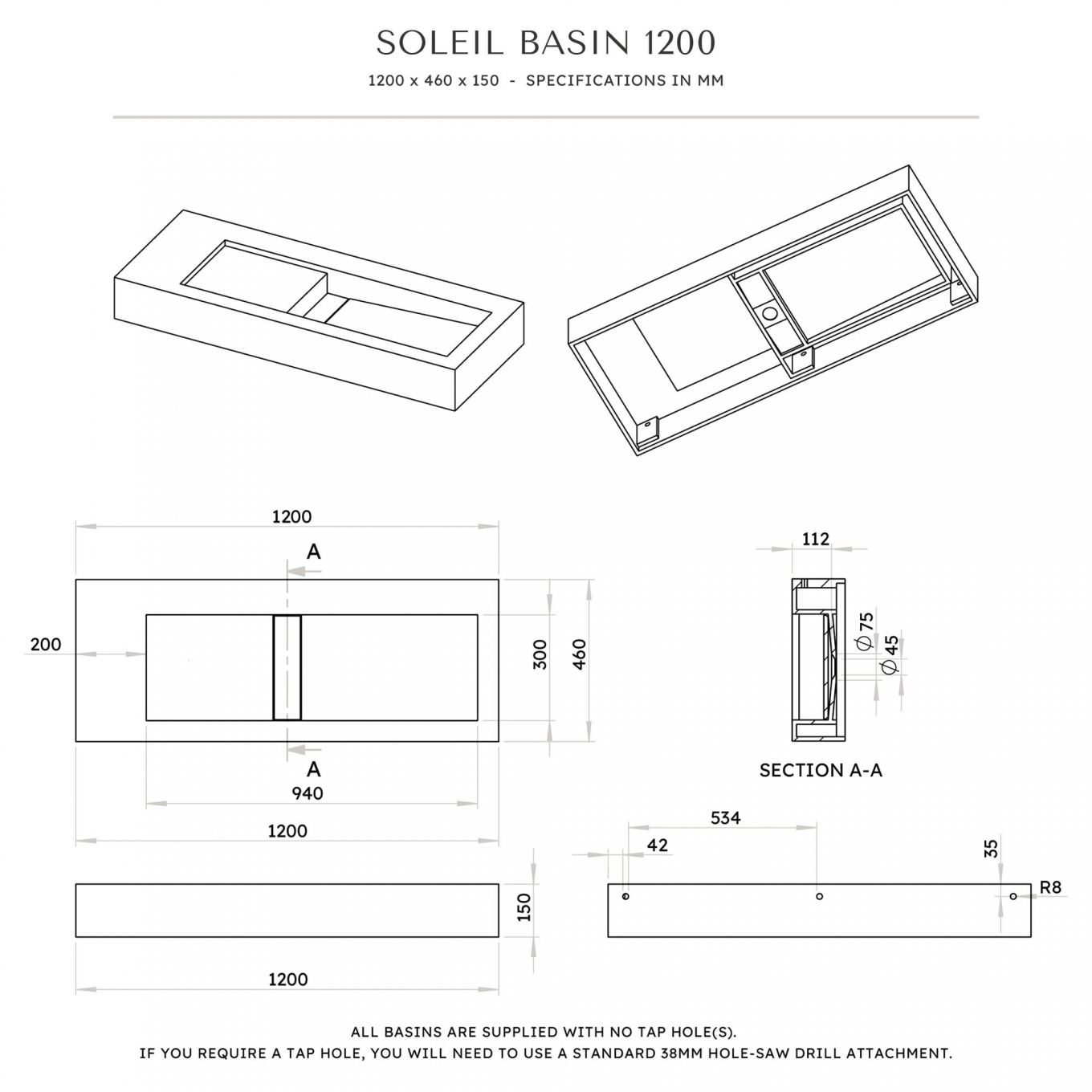 Soleil Solid Surface Stone Resin Wall Hung Basin 1200